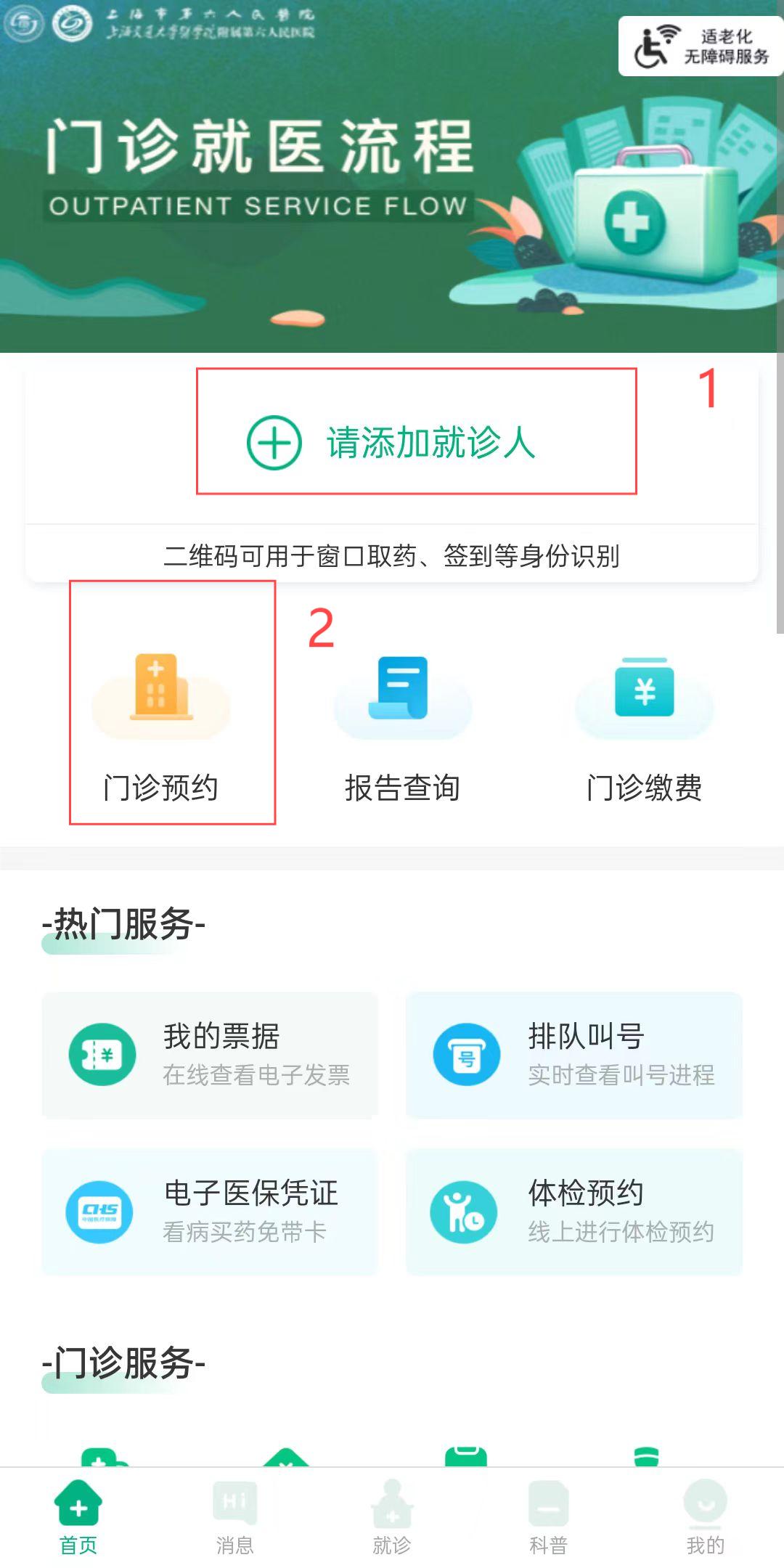 2. 点击“门诊预约”,进入主界面,按照要求添加好就诊人资料